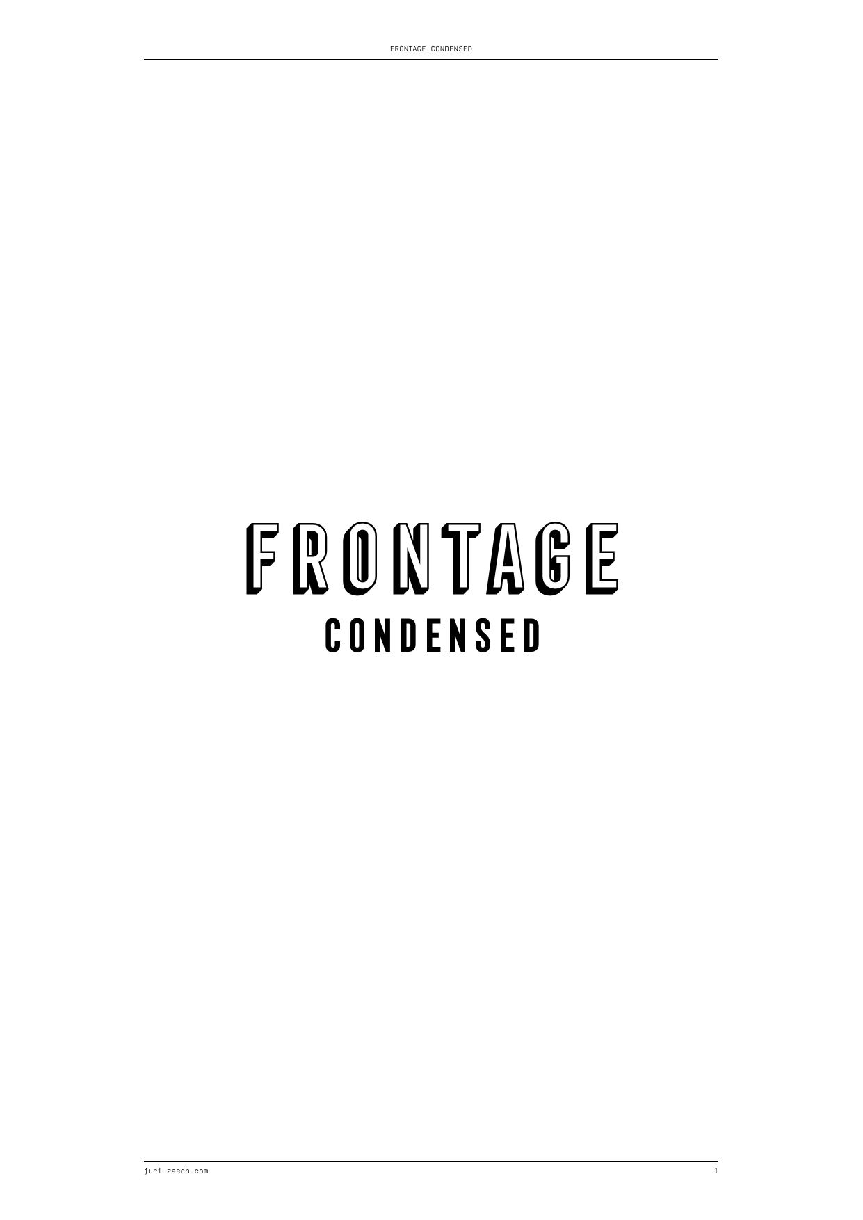 Frontage Condensed features 52 catchwords. They can be simply activated through OpenType’s Discretionary Ligatures and are an easy way to enrich the typographic texture. Other features include fractions, numerators and denominators. Frontage Condensed’s 339-character set covers over 190 latin languages. ■